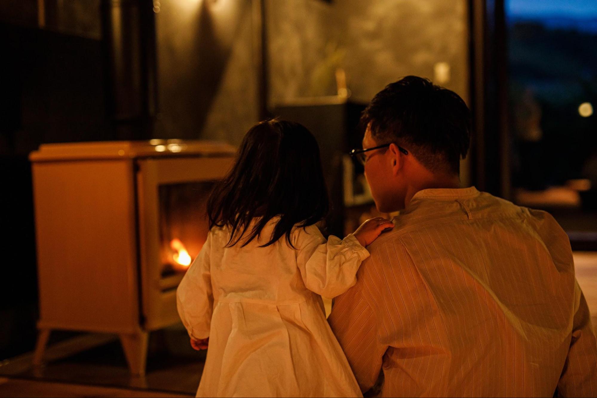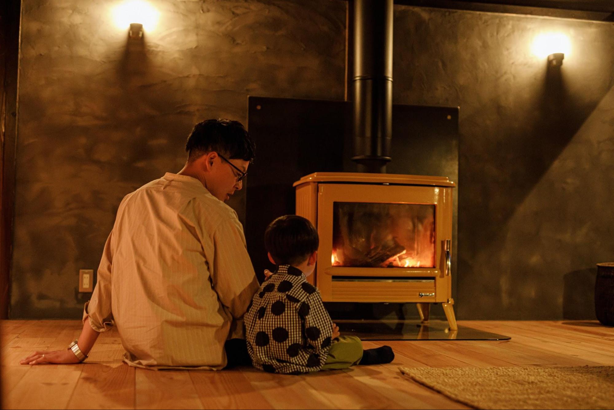 After a warm bath and bedtime, the house becomes completely still. This is the perfect moment for adults to sit by the wood stove with a glass of wine—a simple but luxurious quiet time.