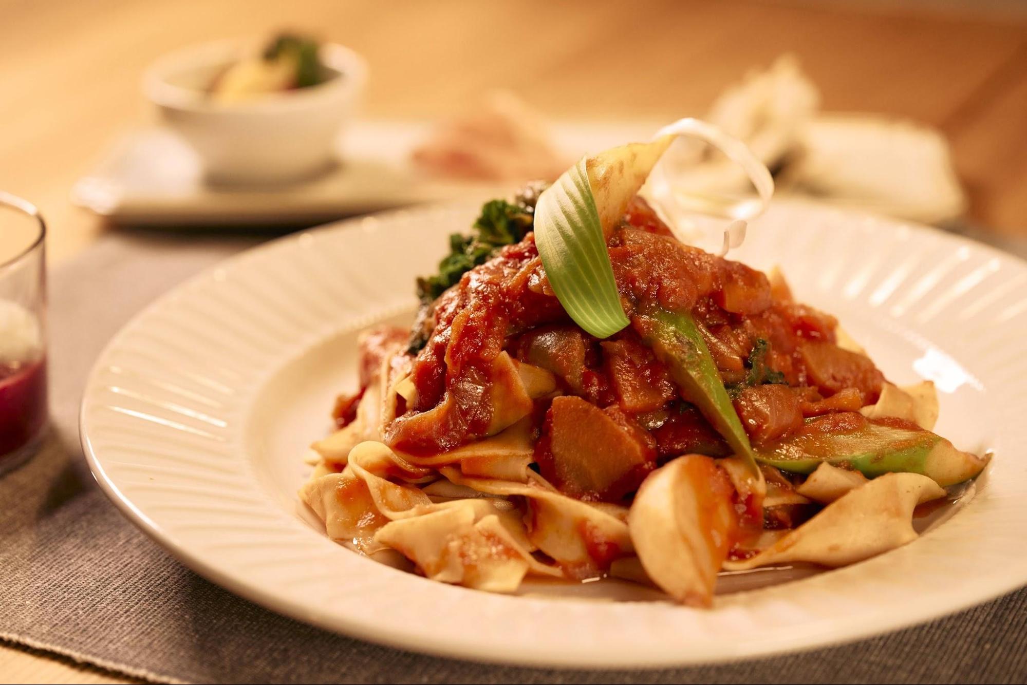 A fresh pasta course using Ina Valley wheat and seasonal local vegetables.